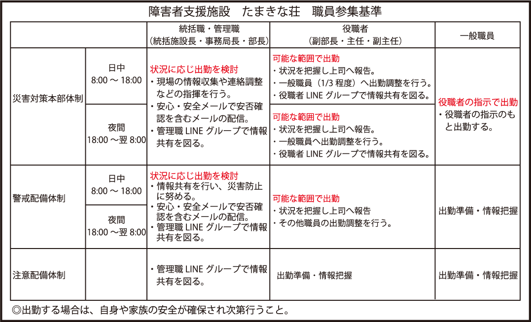 2025.12.04 たまきな荘 自然災害発生時の職員参集基準について 事業継続計画に基づき、自然災害発生時の職員参集基準を見直しました。 詳細は下記のリンクからご確認ください。 <職員参集基準> <災害配備態勢> 一覧へ戻る お知らせ たまきな荘 地域福祉センター すまいるきっず 風工房 いこいば さくら保育園 地域福祉交流館 その他 2025.12.04 自然災害発生時の職員参集基準について 2025.10.30 令和7年度 地域連携推進会議を開催しました 2025.05.23 熊本県福祉サービス第三者評価の受審について 2023.12.09 ポインセチアを頂きました 2023.12.09 お花を頂きました